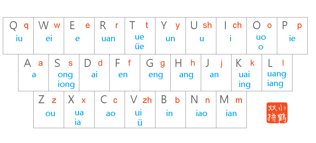 跟五笔一样,你得先知道每个键对应什么音才行,所以第一步是背表。下面这张图就是小鹤双拼的键位表。